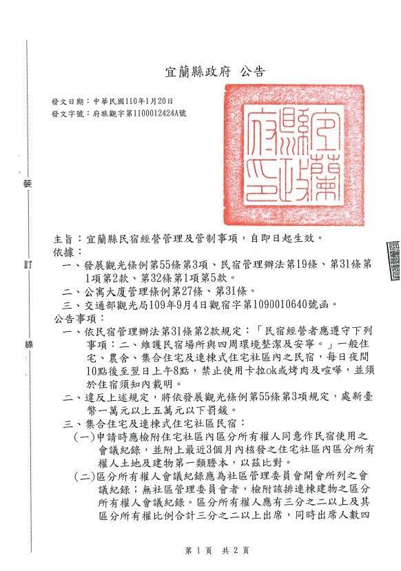 14. 請遵守宜蘭縣政府公告觀光條例及管制事項,維護民宿場所及四周環境整潔與安寧。 每日夜間10點以後禁止使用卡拉ok、烤肉、放鞭炮、喇叭等擴音設備,違反上述規定將處新臺幣一萬元以上五萬元以下罰鍰。